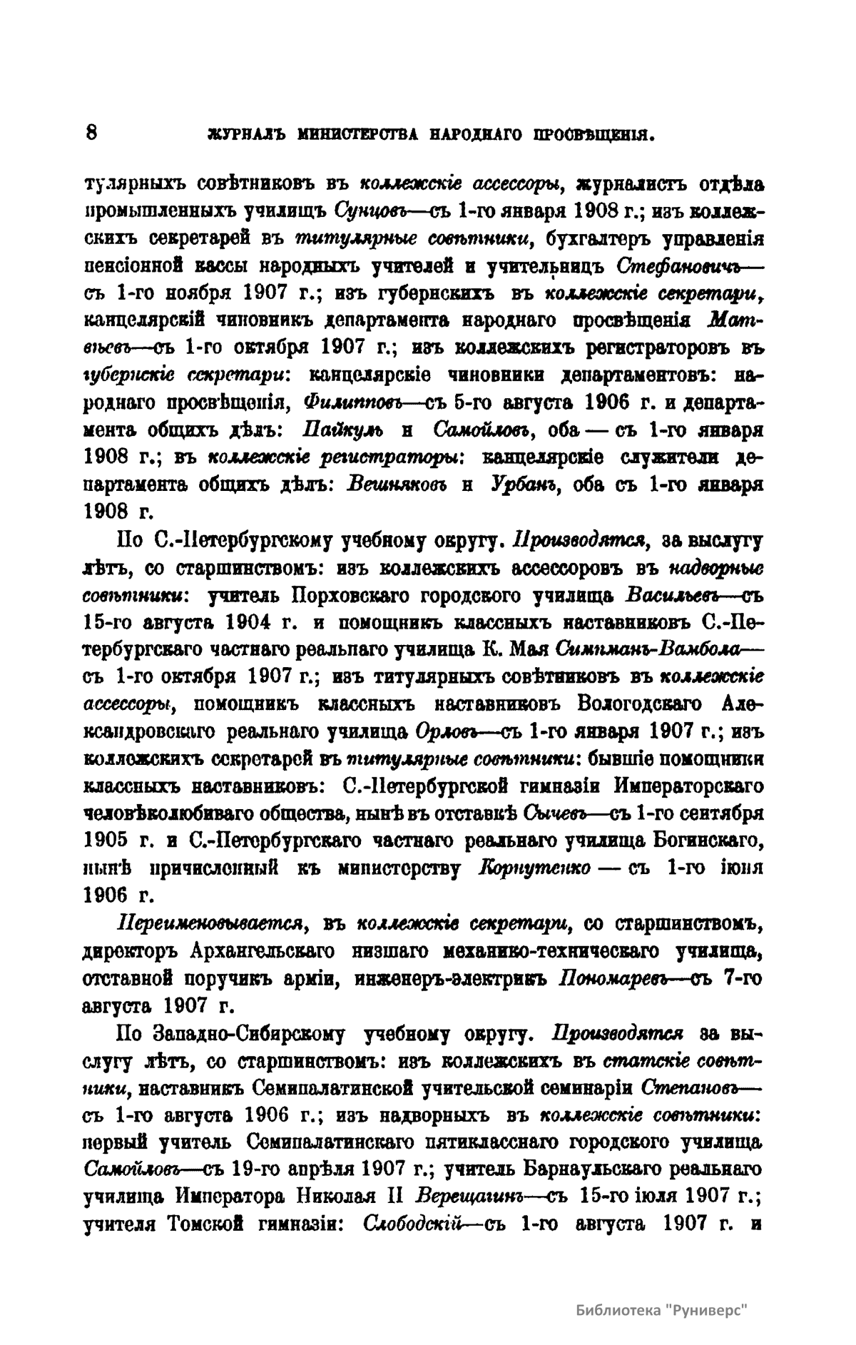 Журнал Министерства народного просвещения выходил с 1834-го по 1917 год. Официальный периодический журнал об успехах просвещения в России. Издатели журнала уверены в том, что «если для каждого человека необходим выход из грубой тьмы невежества и беспрерывное дальнейшее движение к свету, то для народов необходимо попечительное участие правительства в образовании. Только правительство имеет все средства знать и высоту успехов всемирного образования, и настоящие нужды Отечества».