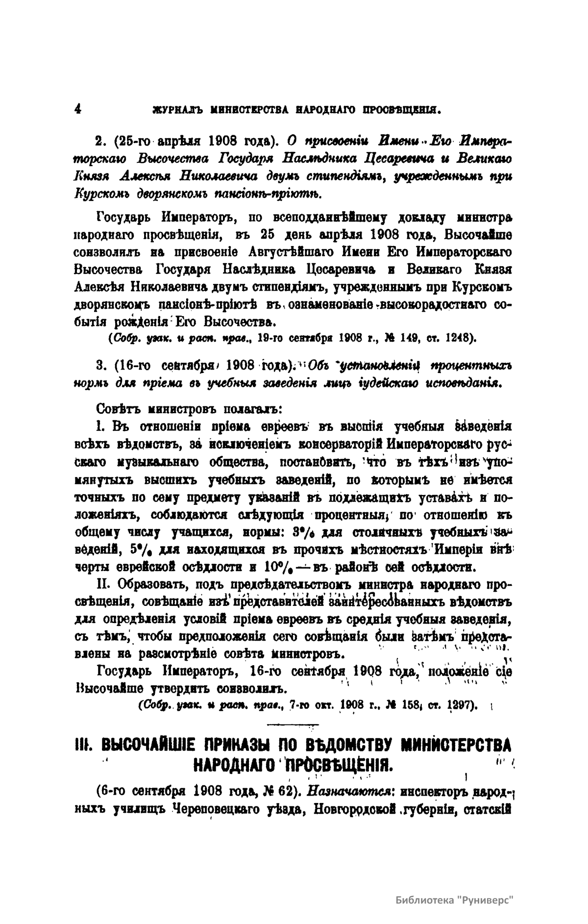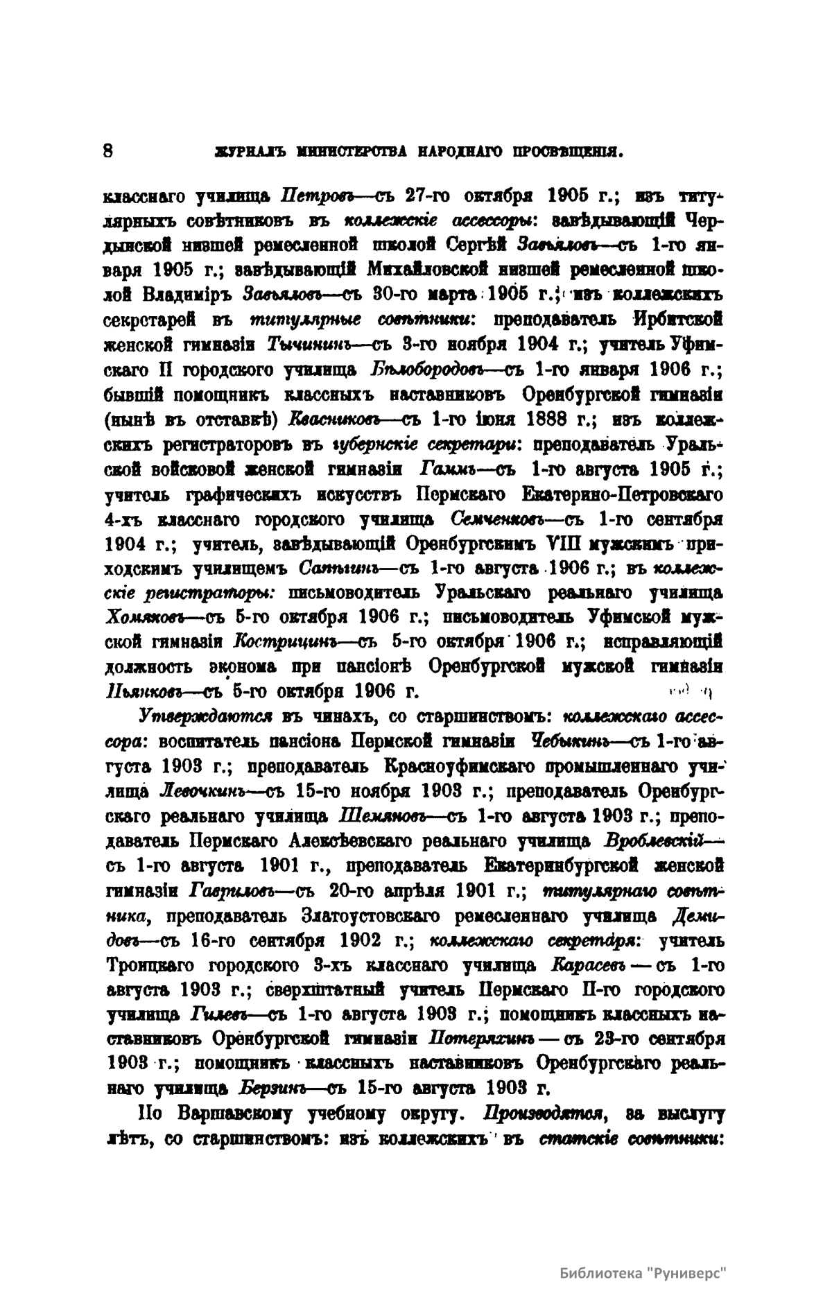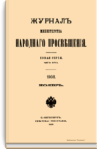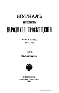 Журнал Министерства народного просвещения выходил с 1834-го по 1917 год. Официальный периодический журнал об успехах просвещения в России. Издатели журнала уверены в том, что «если для каждого человека необходим выход из грубой тьмы невежества и беспрерывное дальнейшее движение к свету, то для народов необходимо попечительное участие правительства в образовании. Только правительство имеет все средства знать и высоту успехов всемирного образования, и настоящие нужды Отечества».