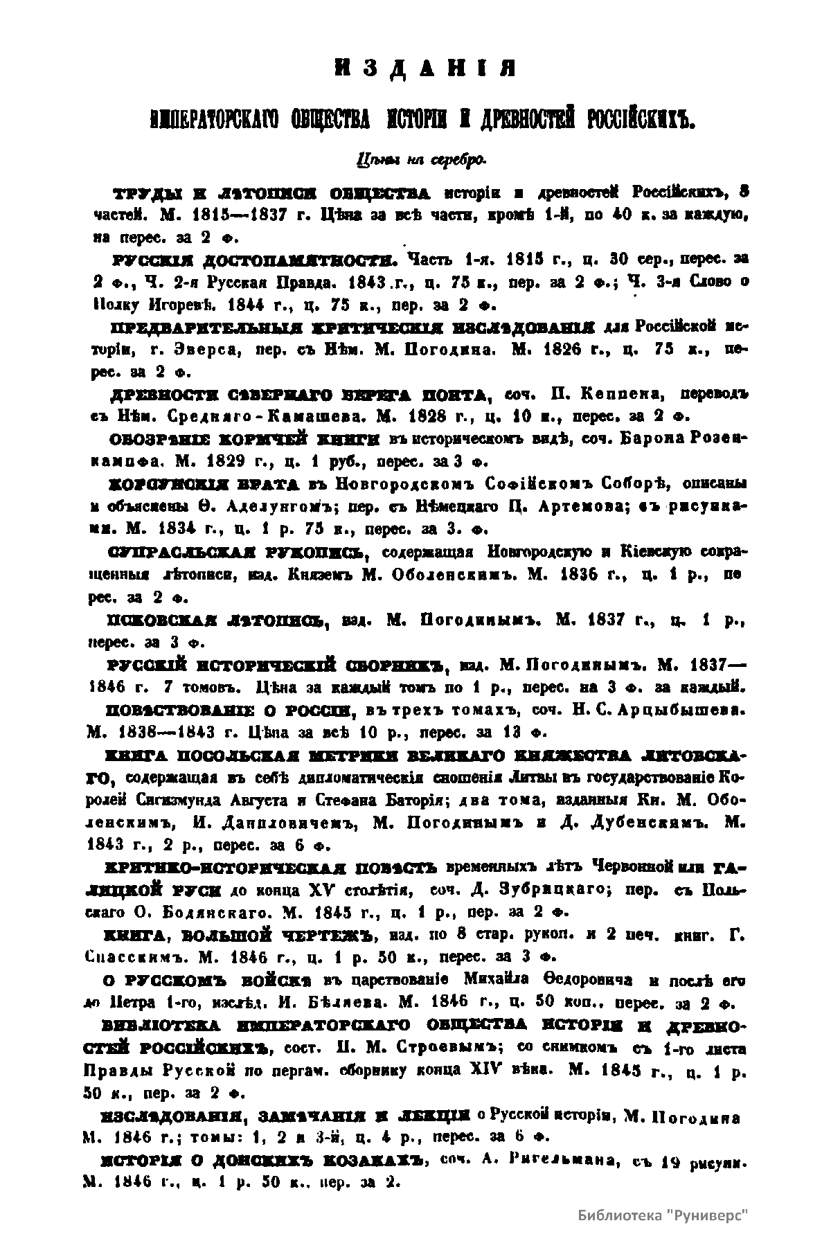 «Чтения в Императорском обществе истории и древностей российских» – периодическое издание трудов Общества. Выпускались отдельными книгами на протяжении 72 лет с десятилетним перерывом. Первая книга вышла в свет в январе 1846 г. Каждая книга состояла из четырех разделов: исторических исследований, отечественных исторических документальных материалов, иностранных материалов и смеси. Публиковались также исследования и материалы по археологии, этнографии, нумизматике, палеографии и другим дисциплинам. До июня 1848 г. было выпущено 23 книги «Чтений». В июньской книге за 1848 г. О. М. Бодянский поместил записки Дж. Флетчера о Московском государстве, что вызвало недовольство Николая I. «Чтения» были закрыты, а Бодянский удален из Московского университета. Издание «Чтений» возобновилось только в 1858 г., когда Бодянский снова стал секретарем общества. Издание приняло славянофильское направление, к прежним четырем разделам «Чтений» прибавился раздел славянских материалов. С 1858 г. «Чтения» выходили в свет четыре раза в год.