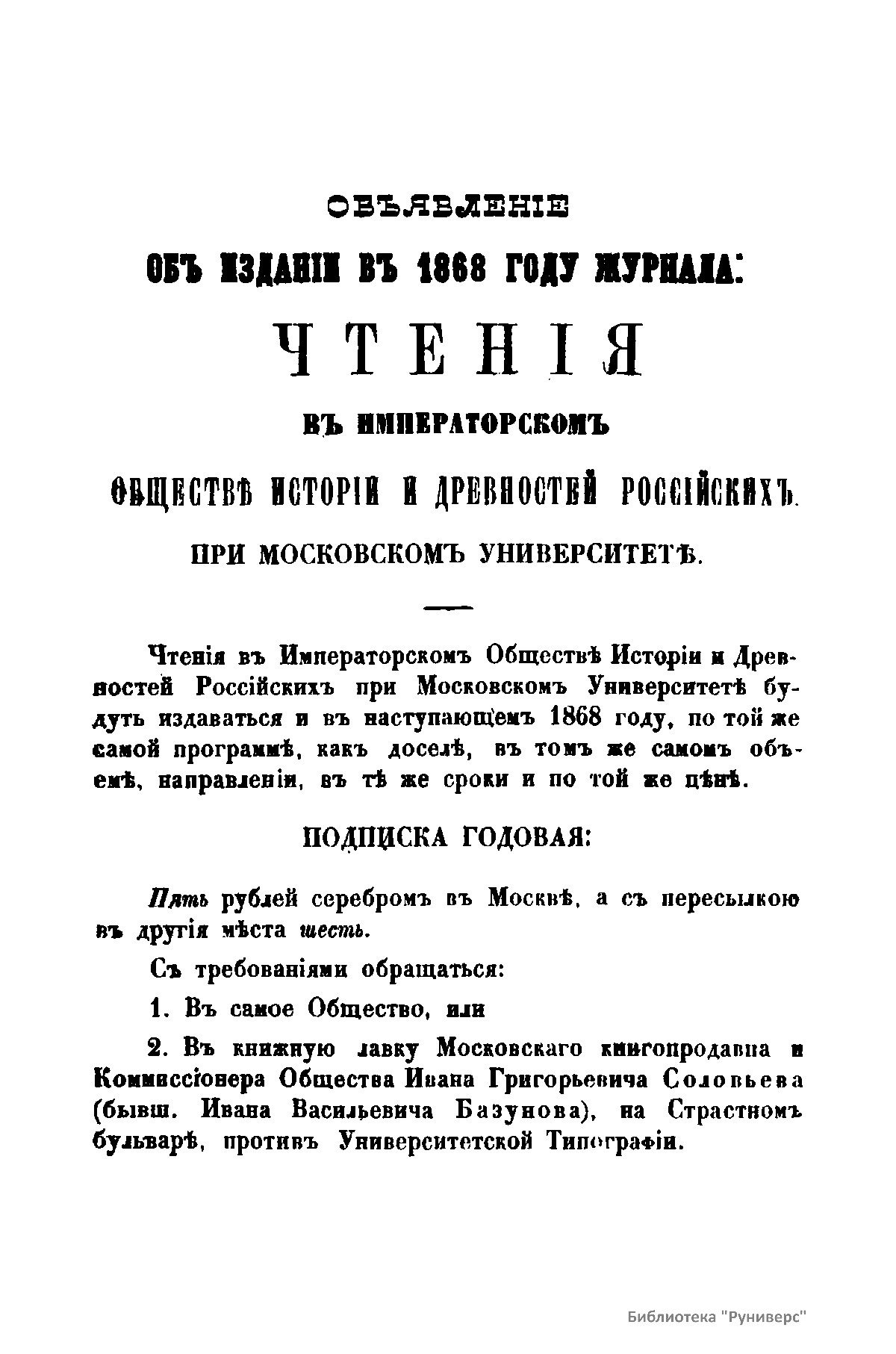 Чтенiя въ Императорскомъ Обществѣ Исторiи и Древностей Россiйскихъ при Московскомъ Университетѣ. 1867. Iюль-Сентябрь. Книга третья