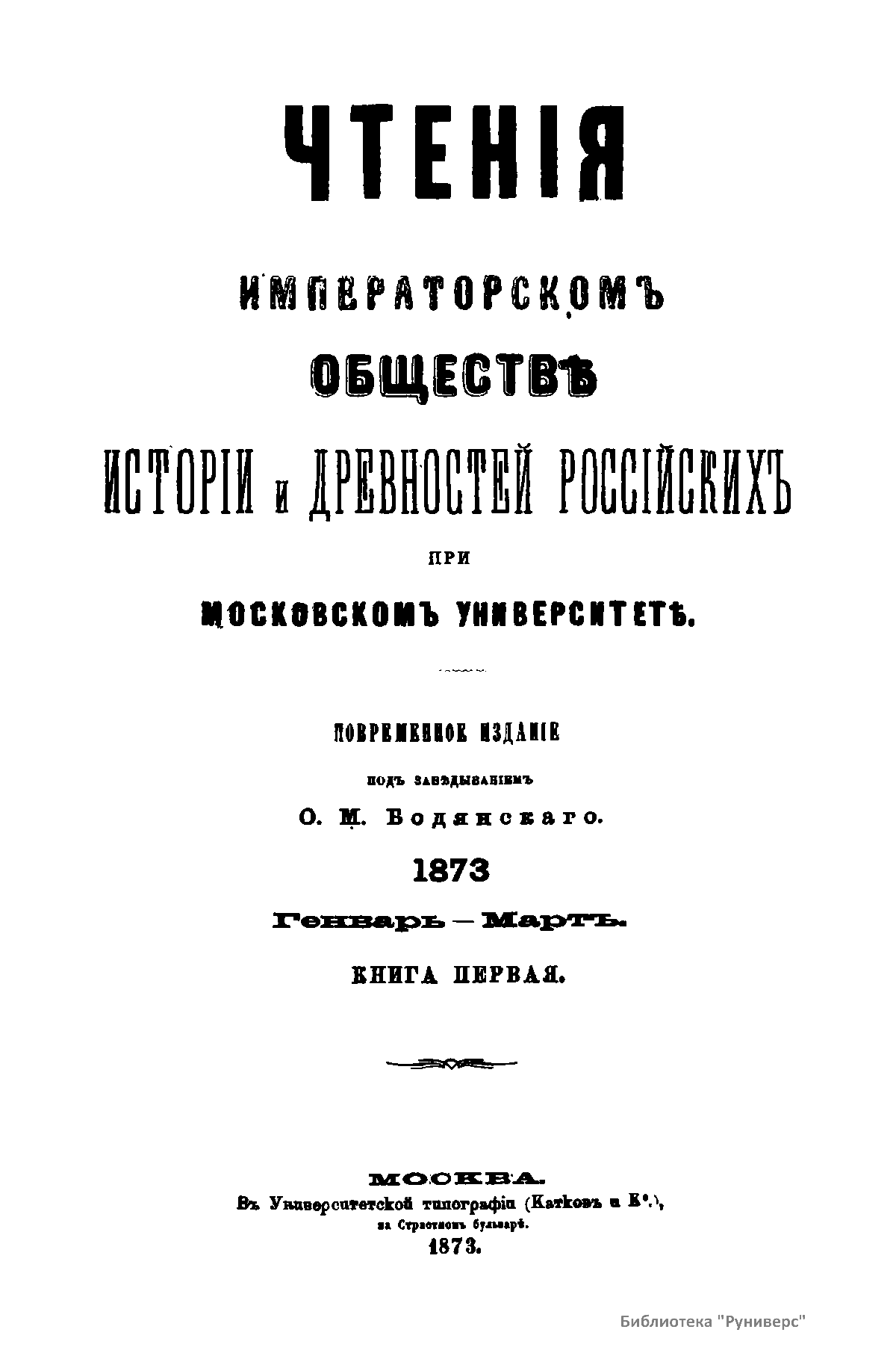 Чтенiя въ Императорскомъ Обществѣ Исторiи и Древностей Россiйскихъ при Московскомъ Университетѣ. 1873. Генварь-Мартъ. Книга первая