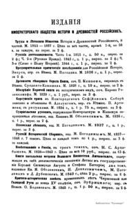 «Чтения в Императорском обществе истории и древностей российских» – периодическое издание трудов Общества. Выпускались отдельными книгами на протяжении 72 лет с десятилетним перерывом. Первая книга вышла в свет в январе 1846 г. Каждая книга состояла из четырех разделов: исторических исследований, отечественных исторических документальных материалов, иностранных материалов и смеси. Публиковались также исследования и материалы по археологии, этнографии, нумизматике, палеографии и другим дисциплинам. До июня 1848 г. было выпущено 23 книги «Чтений». В июньской книге за 1848 г. О. М. Бодянский поместил записки Дж. Флетчера о Московском государстве, что вызвало недовольство Николая I. «Чтения» были закрыты, а Бодянский удален из Московского университета. Издание «Чтений» возобновилось только в 1858 г., когда Бодянский снова стал секретарем общества. Издание приняло славянофильское направление, к прежним четырем разделам «Чтений» прибавился раздел славянских материалов. С 1858 г. «Чтения» выходили в свет четыре раза в год.