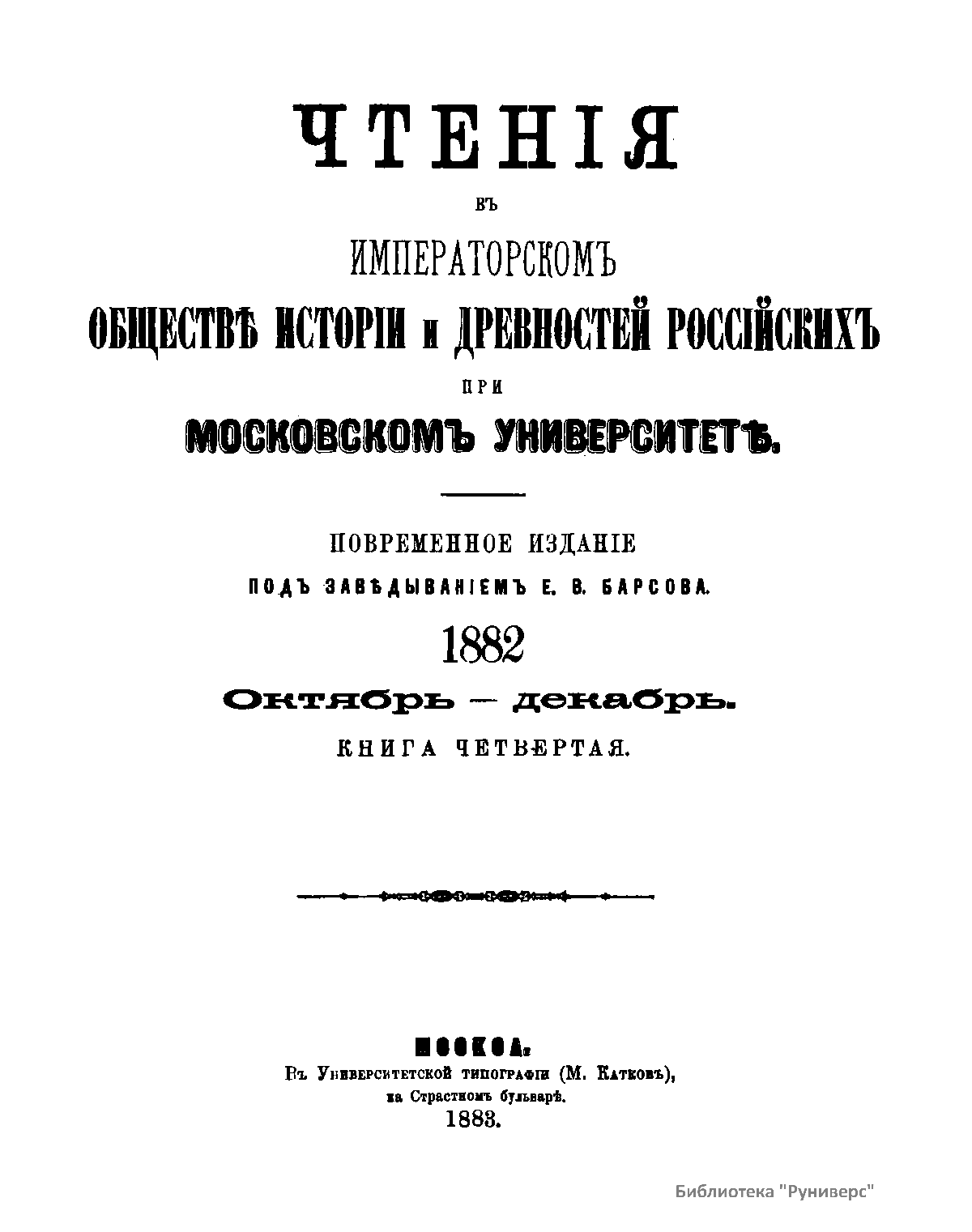 Чтенiя въ Императорскомъ Обществѣ Исторiи и Древностей Россiйскихъ при Московскомъ Университетѣ. 1882. Октябрь-Декабрь. Книга четвертая