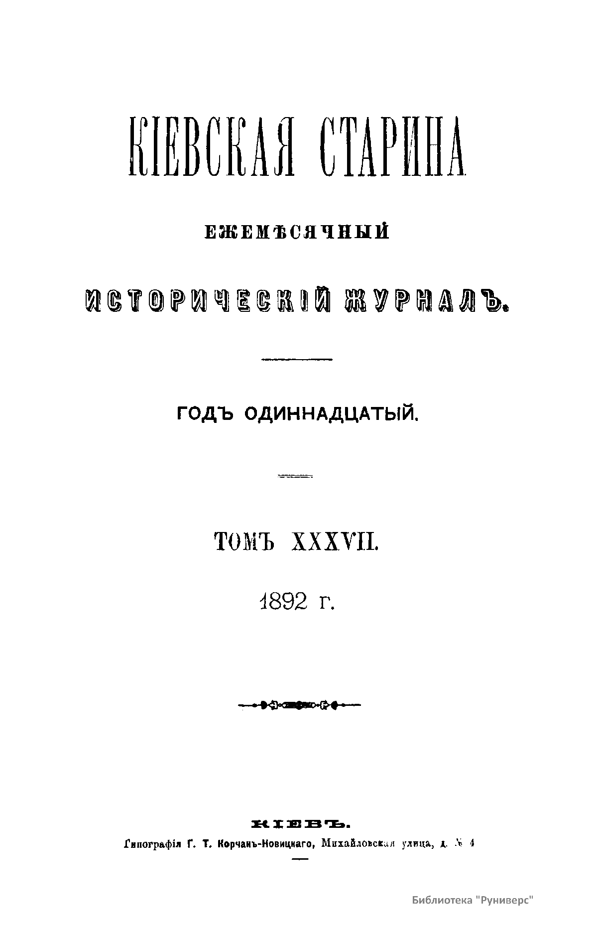 Киевская старина. Год одиннадцатый. Том XXXVII. Апрель-Июнь 1892 г.