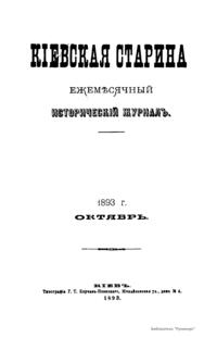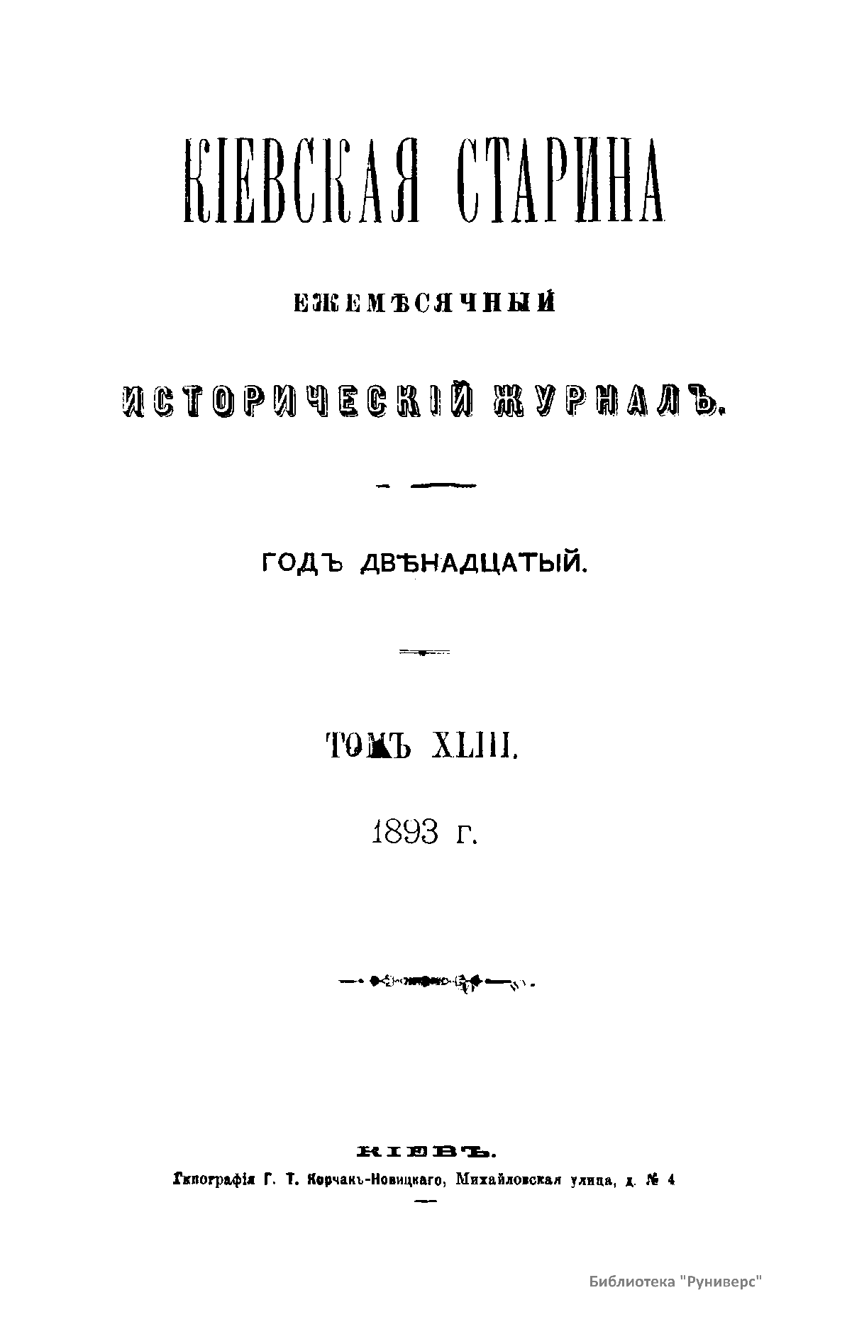 Кiевская старина. Годъ двѣнадцатый. Томъ XLIII. Октябрь-Декабрь 1893 г.