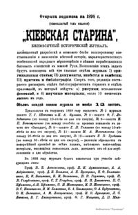 «Киевская старина» - исторический журнал, выходил ежемесячно в Киеве в 1882 – 1906 гг. на русском языке. Основатель и первый редактор – историк Ф.Г. Лебединцев. Публиковал статьи по истории, археологии, этнографии, географии и литературе Украины, документы о видных деятелях украинской культуры (Г.С. Сковороде, И.П. Котляревском, Т.Г. Шевченко и др.) С конца 1890-х гг. в журнале печатались произведения украинских писателей (И. Франко, М. Коцюбинского, Леси Украинки, Панаса Мирного и др.). В журнале принимали участие В.Б. Антонович, Д.И. Багалей, П.С. и А.Я. Ефименко и др. В 1907 г. выходил под названием «Украина» на украинском языке.