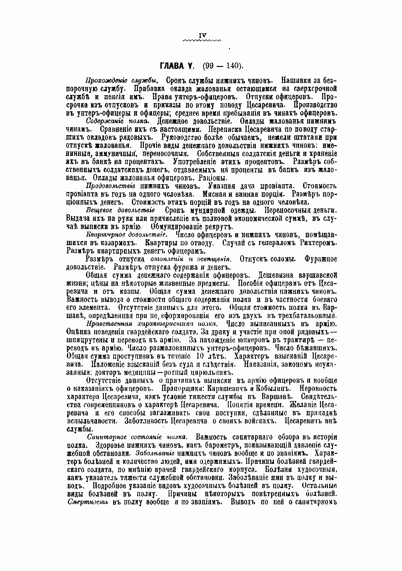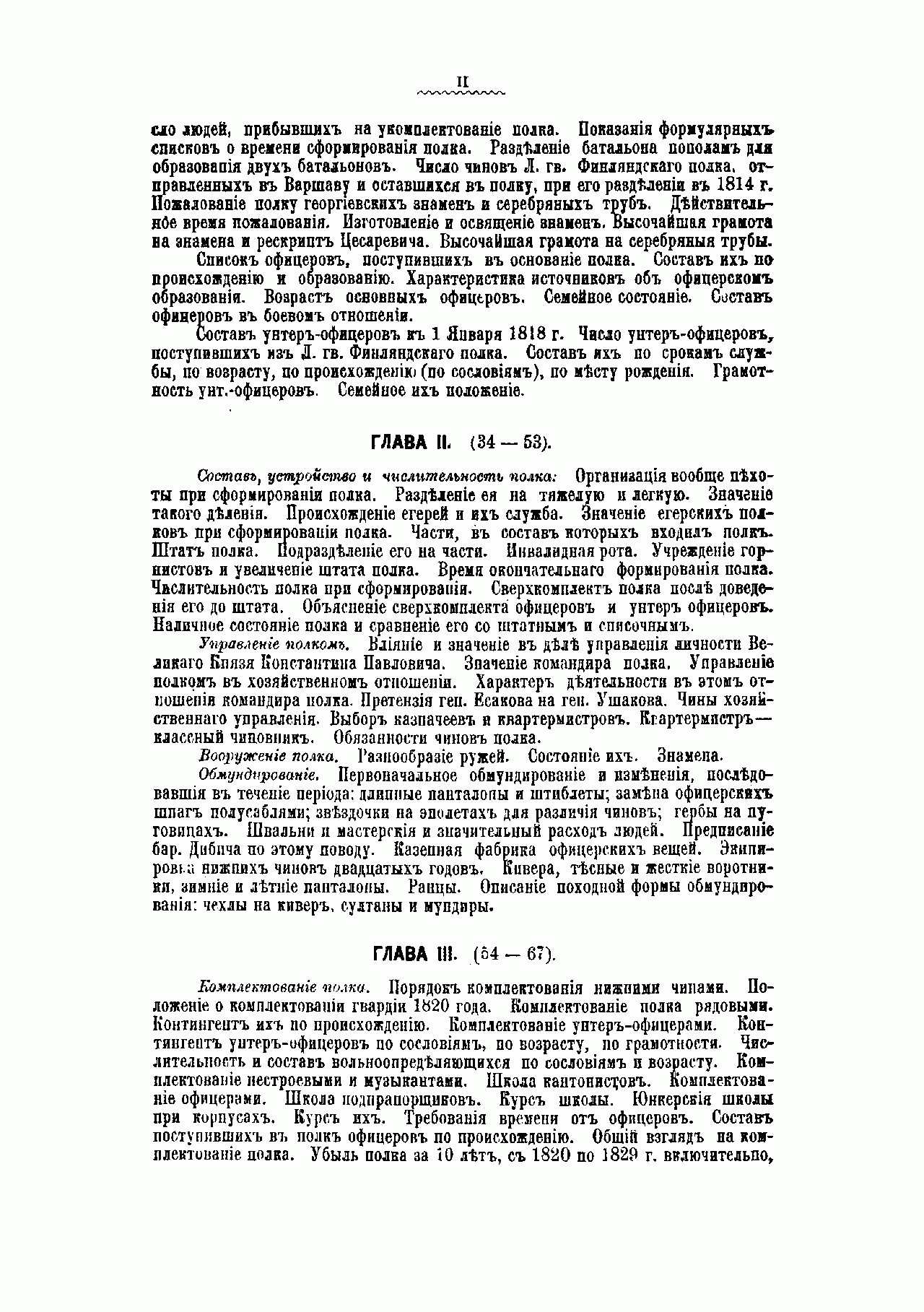 Автор разделил полковую историю по царствованиям. Так, в 1-й части труда повествование охватывает эпоху Александра I и Николая I (до 1849 г.), а 2-я часть в основном посвящена событиям периода правления Александра II, включая боевые эпизоды участия полка в «Восточной войне» 1853-1956 гг. Автор сознательно избегает общеполитических рассуждений, концентрируя внимание на «внутренней» полковой истории. Так, отдельные главы посвящены прохождению службы офицеров и младшего командного состава, продовольственному и санитарному состоянию, морально-нравственной атмосфере в полку и др.