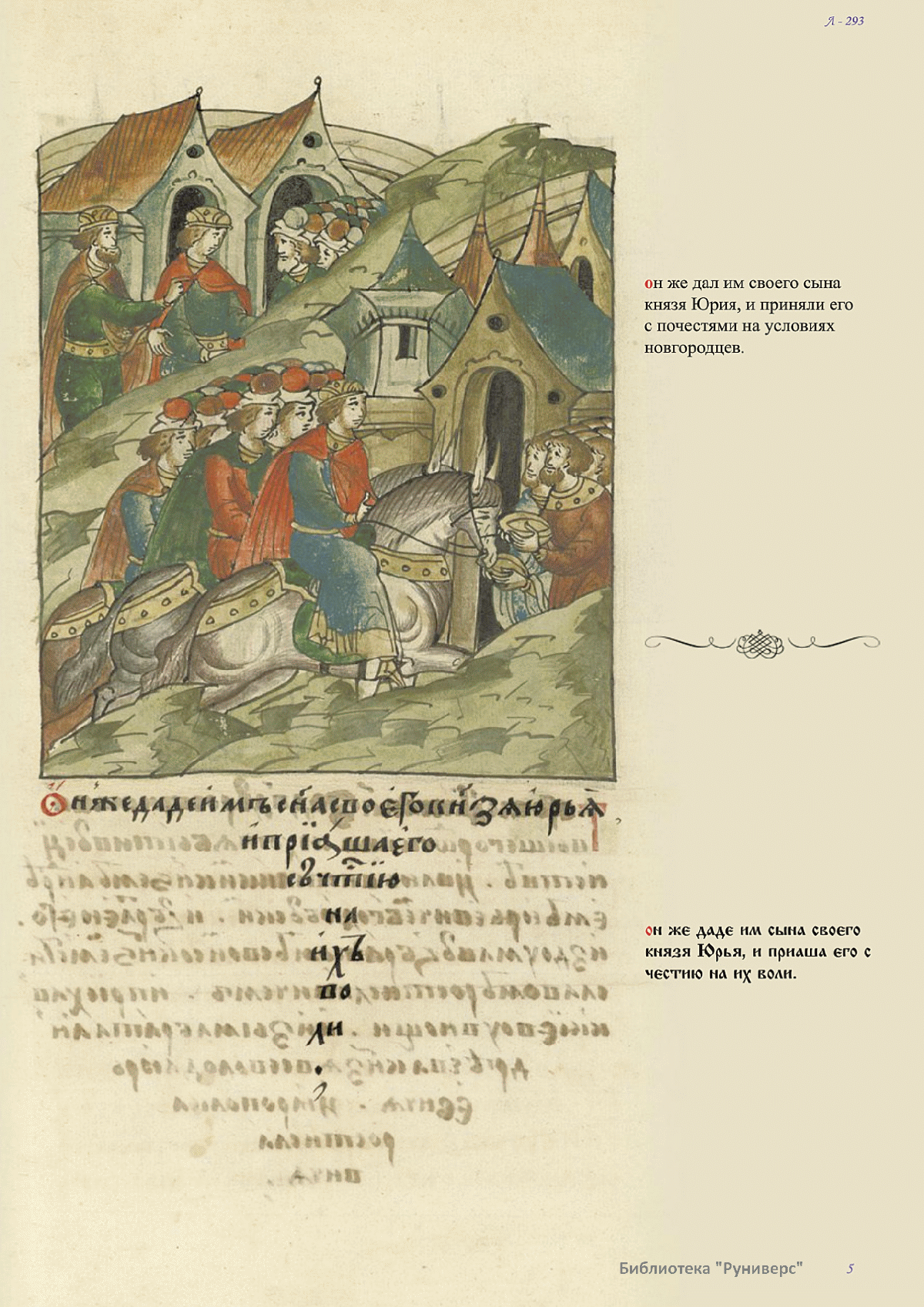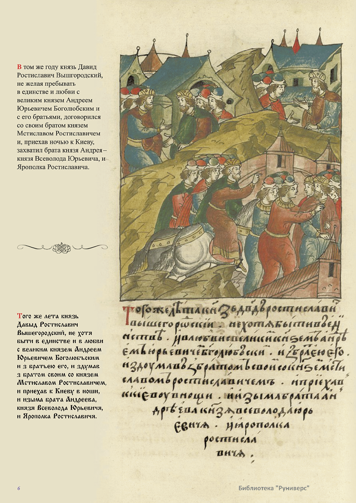 Лицевой летописный свод. XVI века — монументальный памятник древнерусского книжного искусства. На 10 тысячах листов с более чем 17 тысячами красочных миниатюр — «окон в историю» — представлена самая ранняя историческая и литературная энциклопедия. Лицевой свод дошел до наших дней в 10 томах, находящихся в разных древлехранилищах: БАН к РНБ в Санкт-Петербурге и ГИМ в Москве. Фирма «АКТЕОН» совместно с хранителями впервые осуществила научное факсимильное издание «Лицевой летописный свод XVI века». Предлагаемое издание с переводом — как дополнение в рамках научного аппарата вышеназванного факсимиле - представлено тремя разделами: библейская история, всемирная история, русская летописная история. В настоящем издании листы расположены в хронологическом порядке повествования На внешнем поле размещены транслитерация и перевод на современный русский язык. Русская летописная история 1114—1567 гг. — отражена на 6010 Лицевого летописного свода XVI века в следующих его томах: Г — Голицынский том (Отдел рукописей Российский национальной библиотеки, F.IV.225), Л — Лаптевский TOM (Отдел рукописей Российской национальной библиотеки, F.IV.233), O-I — Остермановский первый том (Отдел рукописей Библиотеки Академии наук, 31. 7. 30-1), O-II — Остермановский второй той (Отдел рукописей Библиотеки Академии наук, 31, 7. 30-2), Ш — Шумиловский том (Отдел рукописей Российской национальной библиотеки, F, IY. 232), С — Синодальный том (Отдел рукописей Государственного Исторического музея. Син. № 962), Ц— Царственная книга (Отдел рукописей Государственного Историческою музея. Син. № 149). В сносках отряжены разночтения с перепей ПСРЛ — Полным собранием русских летописей - фундаментальной для изучения истории древней и средневековой Руси книжной серией (её тексты, в основном, издавались наборно, в орфографии XIX века).