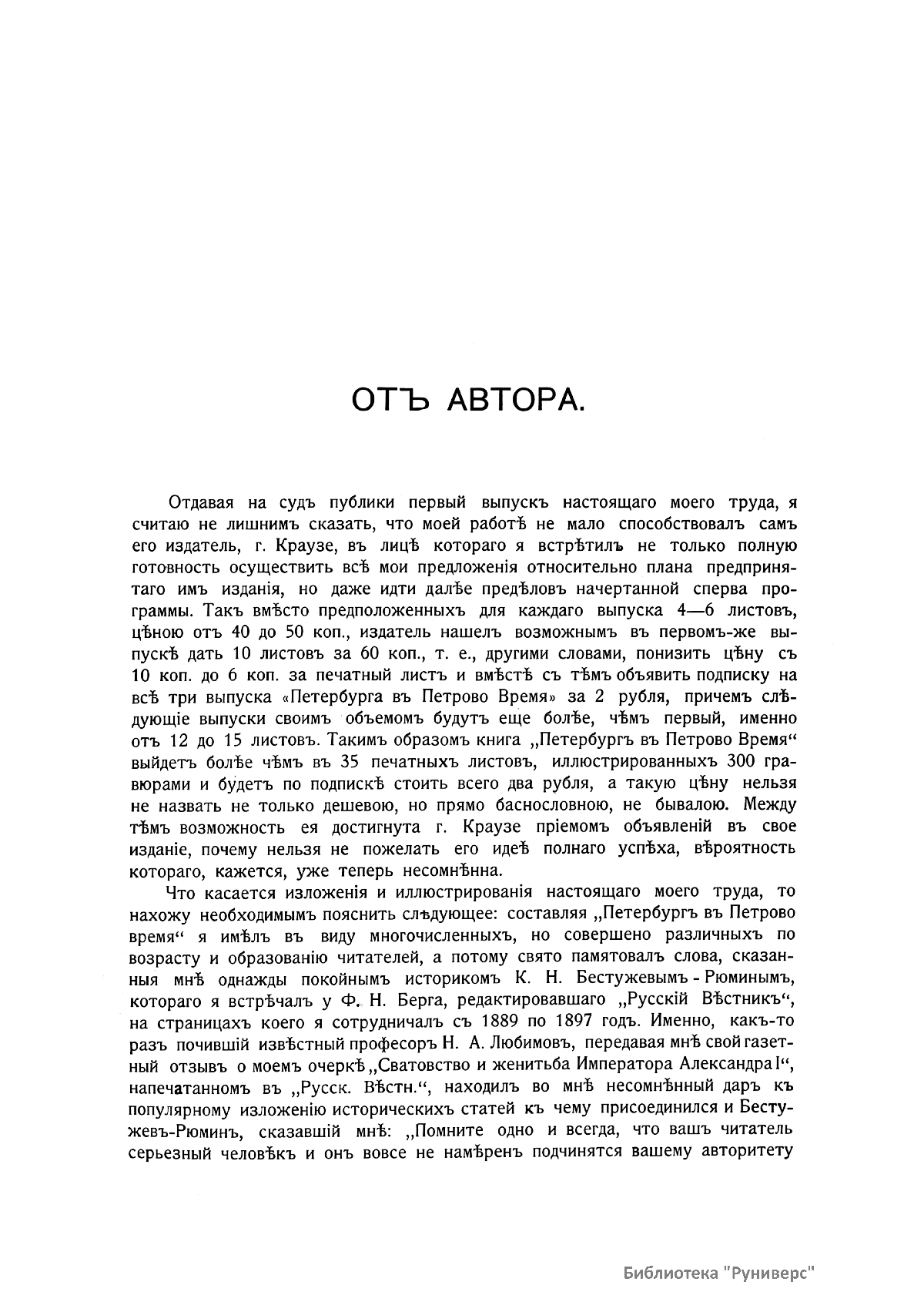 Книга И. Н. Божерянова была издана к 200-летию Санкт-Петербурга (издатель X. Краузе). Истинным украшением этого прекрасного исторического очерка стали 300 гравюр из коллекции П. Я. Дашкова, на которых отображена история Санкт-Петербурга с момента его основания до начала XX века. Рассказ иллюстрируют редкие фотографии и различные зарисовки, выполненные фототипией. В издании представлены богатейшие сведения о северо-западных землях в глубокой древности, которые с первых дней существования Русского государства входили в его состав; о выдающихся людях, живших в столице Российской империи: членах царской фамилии, высших сановниках, крупных предпринимателях, деятелях науки, литературы, искусства и культуры, о первых строителях Северной Пальмиры. Интереснейшие истории о былом основаны на данных из первоисточников, являвшихся библиографической редкостью уже в дореволюционной России. Это «Письма и бумаги Петра Великого», «Описание Санкт-Петербурга», «Записки графа Миниха» Богданова и др. Эти материалы дают возможность по-новому рассмотреть личность Петра и его деяния. Ценность издания в значительной степени увеличивается благодаря размещенным в конце книги подробным сведениям о крупных предприятиях, которые появились к началу XX века в Санкт-Петербурге (Товарищество Табачной фабрики Саатчи и Мангуби — поставщик Двора его императорского величества, и др.). Эти данные дополнены художественно оформленными фотографиями.