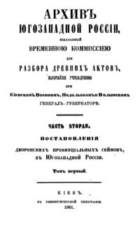 В серии «Архив Юго-Западной России» были напечатаны документы Киевского архива. Издание было предпринято Киевской археографической комиссией с 1859 по 1911 год. Всего вышло 34 тома.