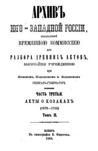 В серии «Архив Юго-Западной России» были напечатаны документы Киевского архива. Издание было предпринято Киевской археографической комиссией с 1859 по 1911 год. Всего вышло 34 тома.