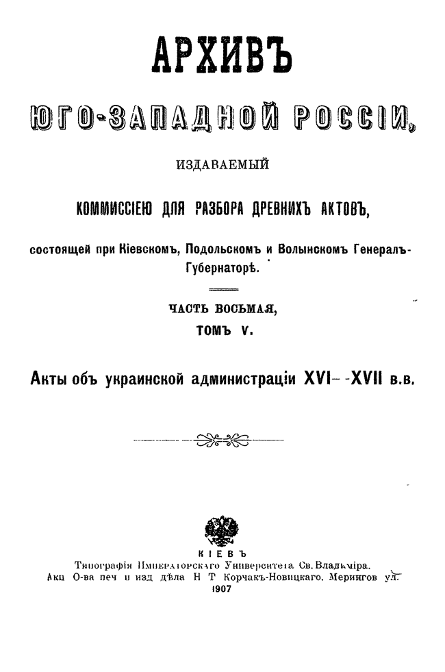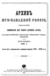 В серии «Архив Юго-Западной России» были напечатаны документы Киевского архива. Издание было предпринято Киевской археографической комиссией с 1859 по 1911 год. Всего вышло 34 тома.