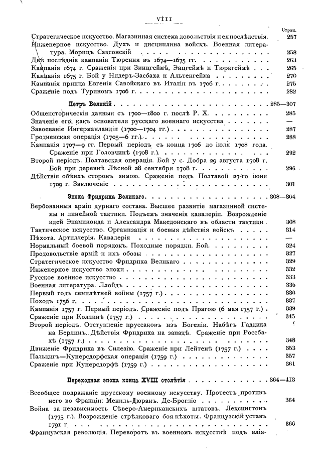 Стараясь выполнить эту программу, а также желая возможно нагляднее показать зависимость состояния военного искусства данной эпохи от современного состояния культуры и цивилизации, главные отделы настоящего сочинения сопровождаются общеисторическими данными, сгруппированными по столетиям. В приведенных перечнях событий указаны только важнейшие научные и практические изобретения, течения в области философии, науки и искусства.